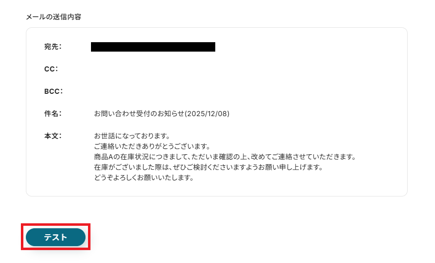 送信が完了したらYoomに戻り「テスト」を実行しましょう。