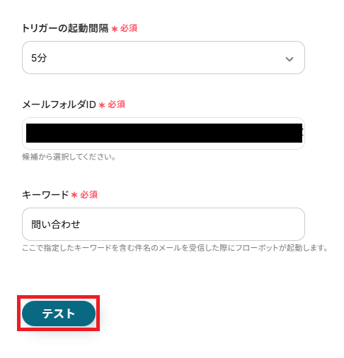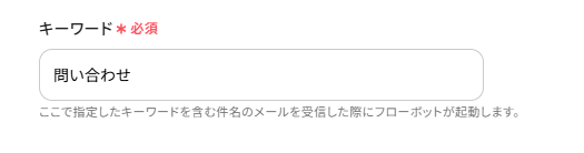 フローボットを起動するための「キーワード」を設定してください。 ここで指定したキーワードを含む件名のメールを受信した際に、フローボットが起動します。 今回のテストでは【問い合わせ】というキーワードを設定しました。