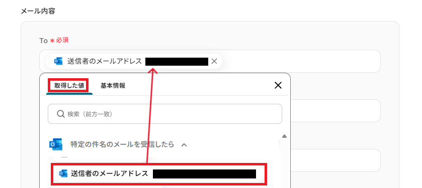 「メールフォルダID」は、入力欄をクリックして表示される候補から選択してください。 候補は、連携しているアカウントに紐づいて表示されます。