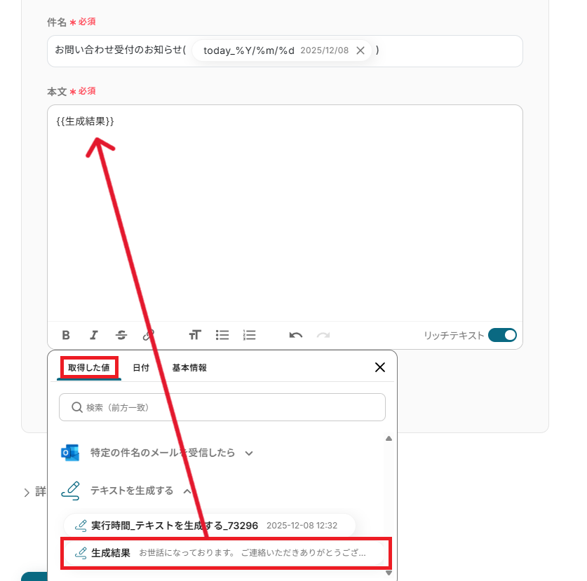 「件名」と「本文」は、取得した値や日付を引用し設定できます。 本文にはAIで生成された返信文を設定しましょう。 入力が完了したら「次へ」を押してください。