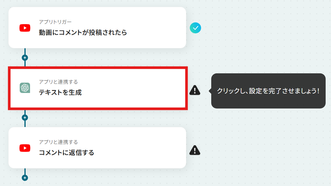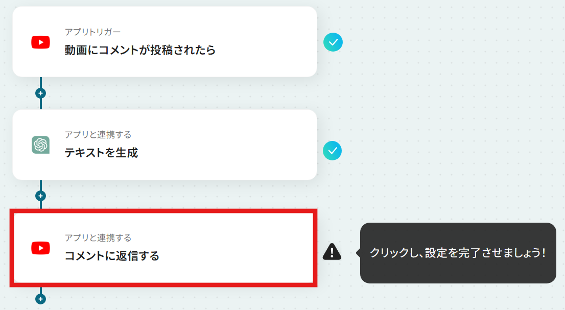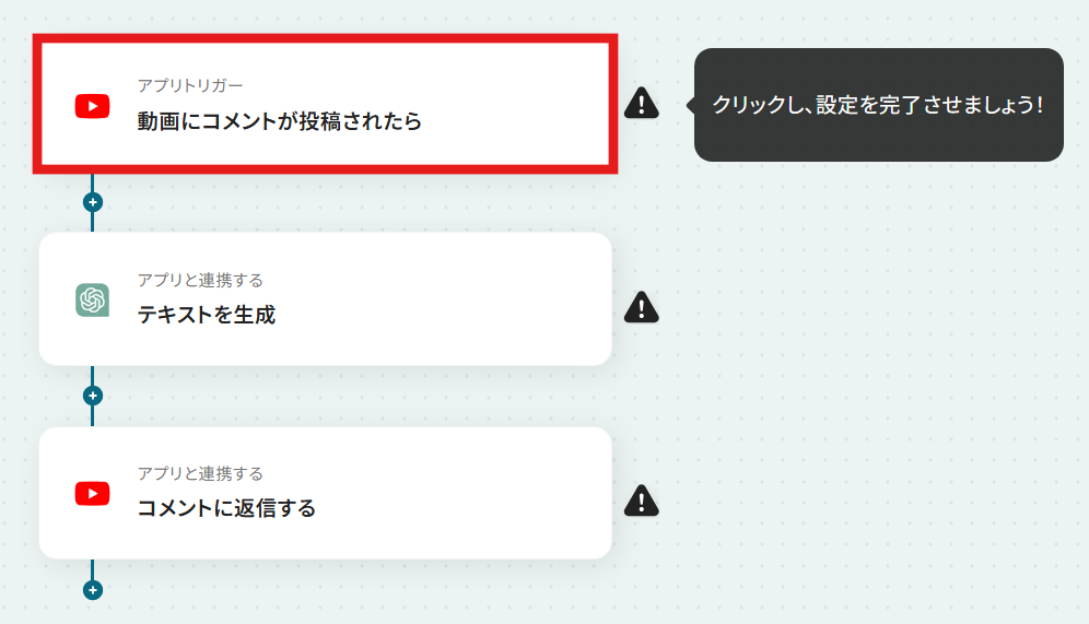 では、YouTubeで動画にコメントが投稿された際に、内容に応じた返信をAIが自動で行うフローを解説していきます!なお、今回は自動返信を行うAIにChatGPTを活用しています。