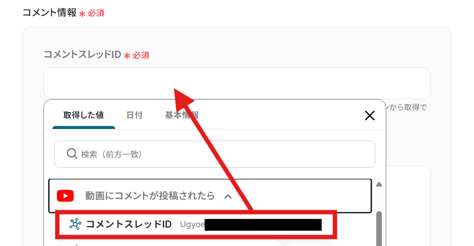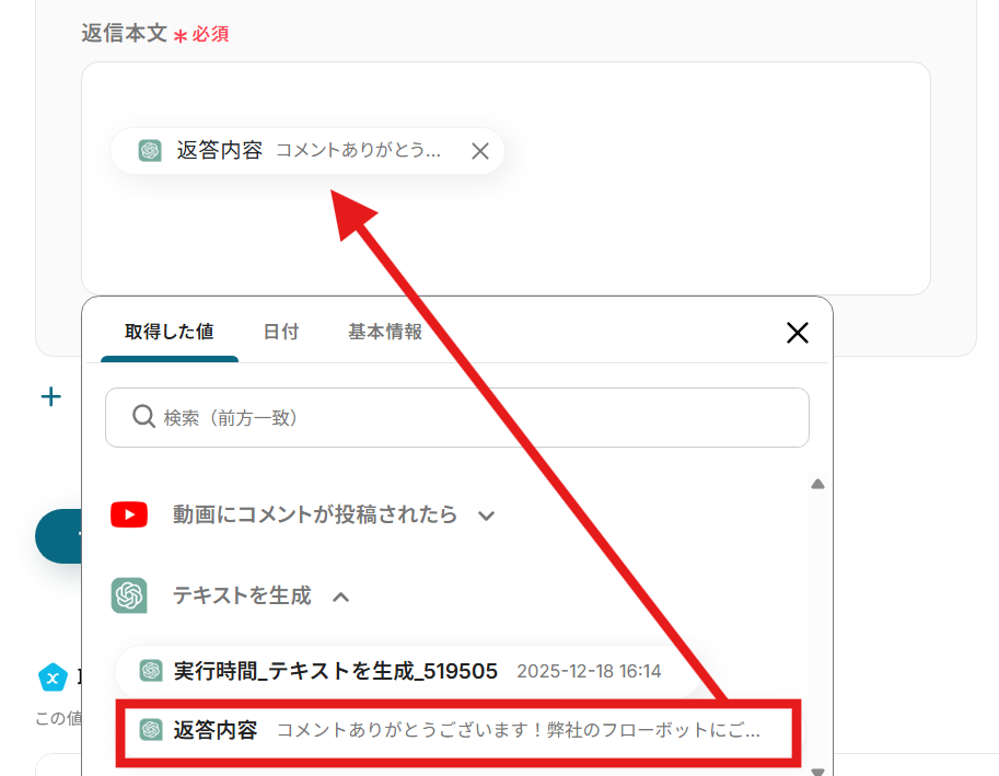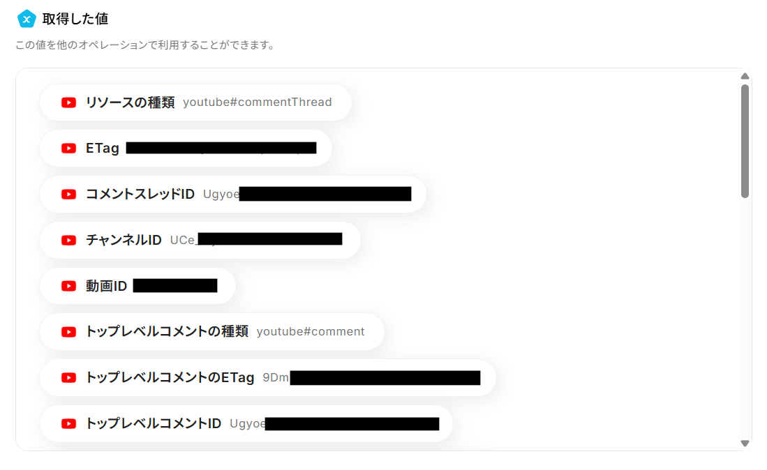 ※「取得した値」を使用することで、固定値ではなく、Youtubeの動画にコメントがされる度に変動した値として使用することが可能です。