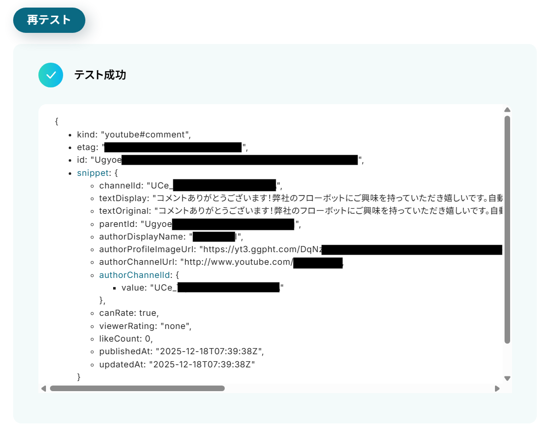 テストが成功すると、テスト成功画面と取得した値が表示され、以下のようなデータが確認できます。正しく返信ができているかYouTubeも確認し、問題がなければ「完了」をクリックしましょう。