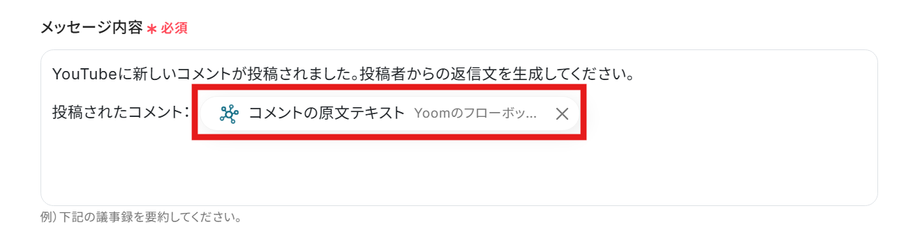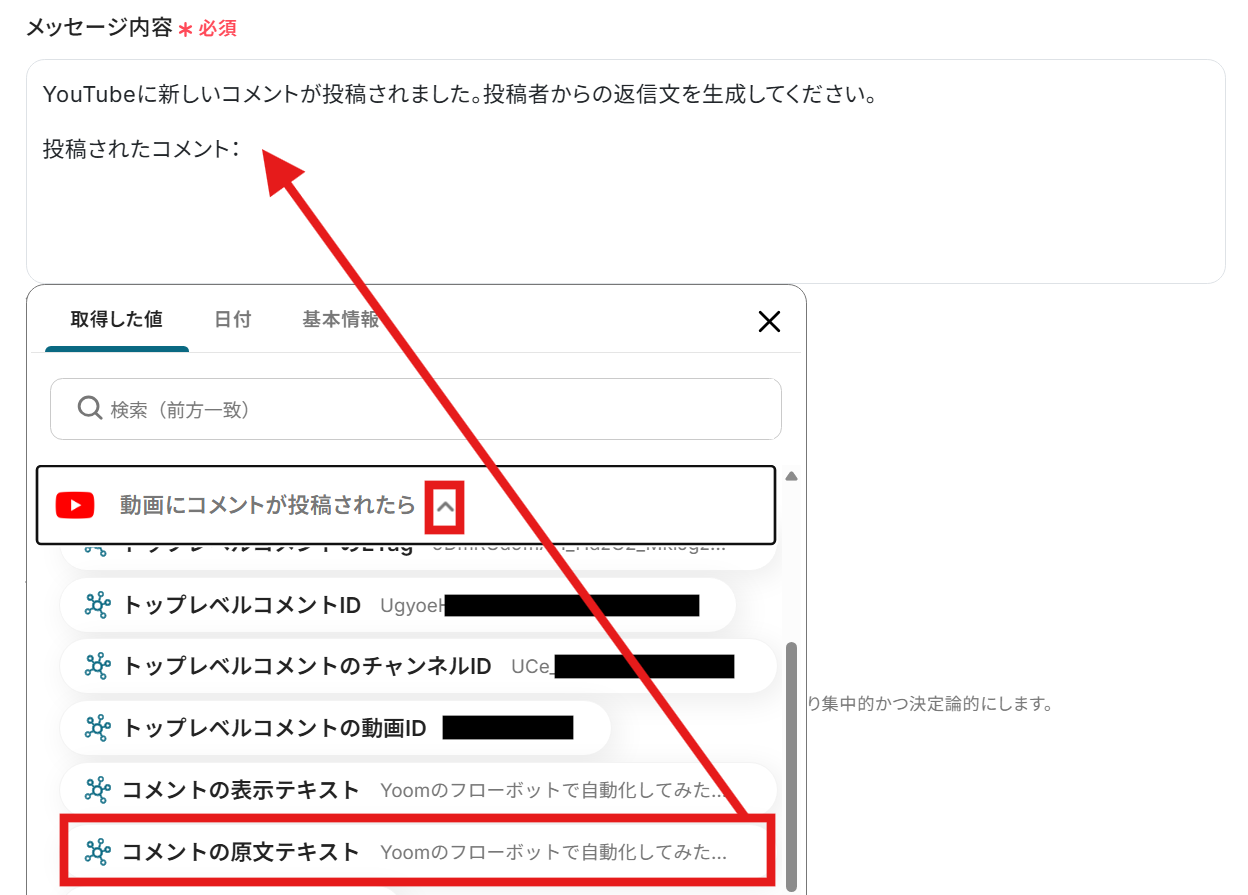 「メッセージ内容」のボックスをクリックし、「動画にコメントが投稿されたら」のプルダウンから「コメント原文のテキスト」を選択してください。