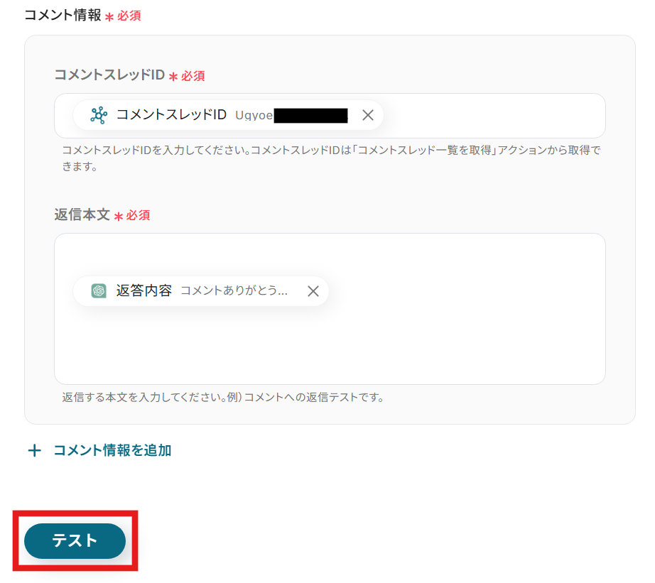 トリガー設定時に取得した値=テスト用に投稿したコメントを用いて設定していきましょう。