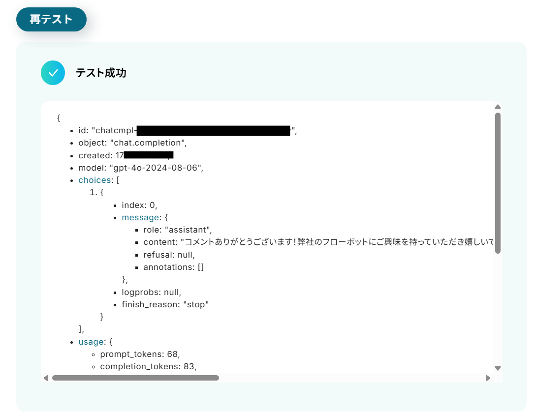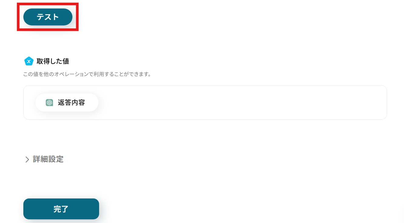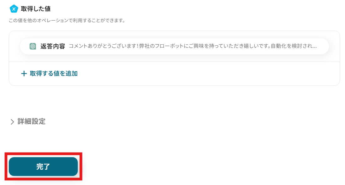 テストが成功すると、テスト成功画面と取得した値が表示され、ChatGPTが生成した返信コメントが確認できます。求めている返信文が生成できているか確認し、問題がなければ「完了」をクリックしましょう。