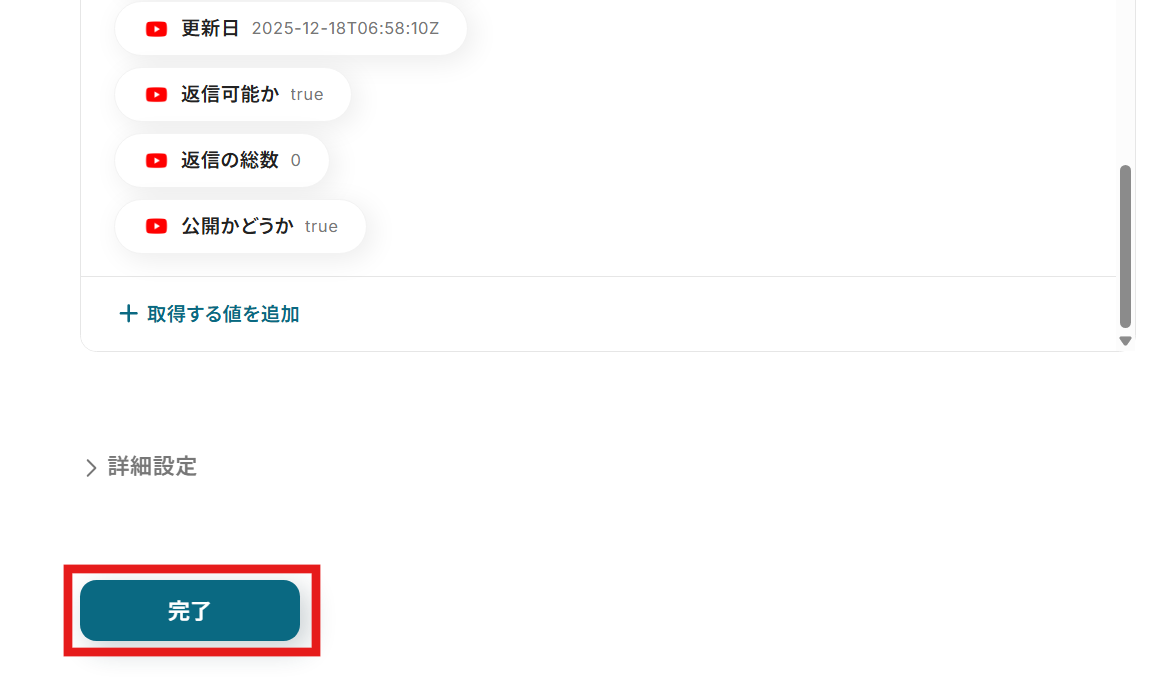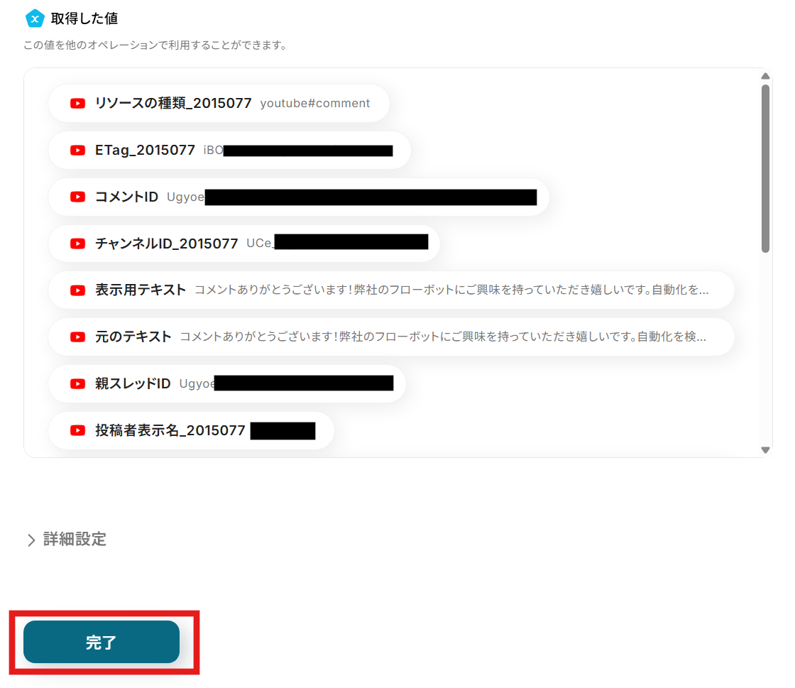 テストが成功するとテスト成功画面と取得した値が表示され、YouTubeのコメントが確認できます。「完了」をクリックして設定完了です!