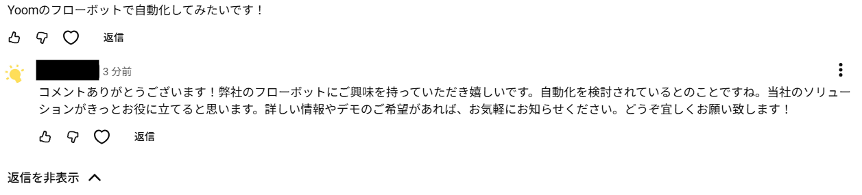 - コメントが投稿されるたびに自動で返信が行われるため、手作業での対応時間を短縮し、本来注力すべきコンテンツ制作などに時間を充てることができます