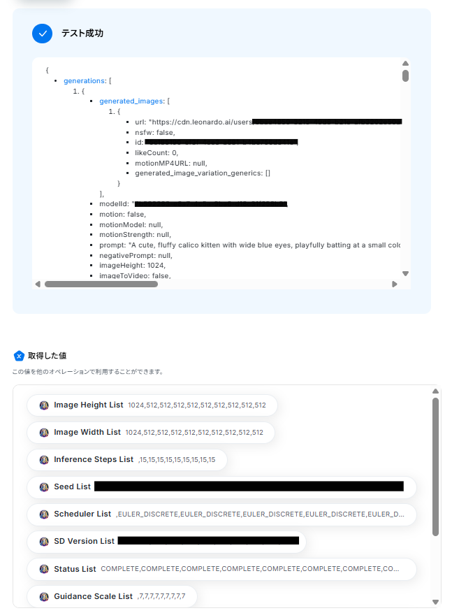 - 繰り返し処理の中で、Leonardo AIを使い画像生成を開始し、生成情報を取得します。