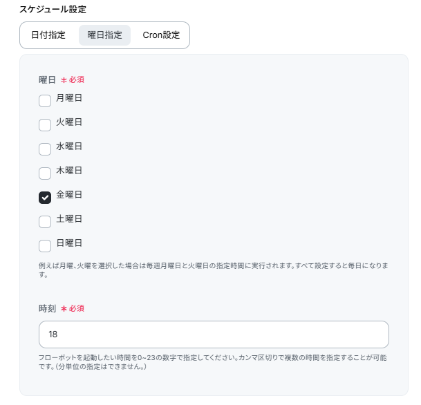 - スケジュールトリガーの設定では、フローボットを起動したい曜日や時間など、業務に合わせた任意のスケジュールを設定してください。