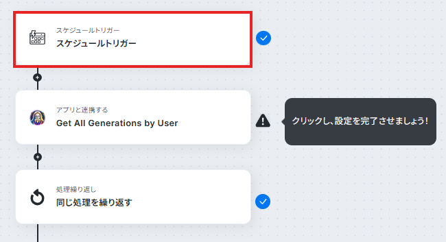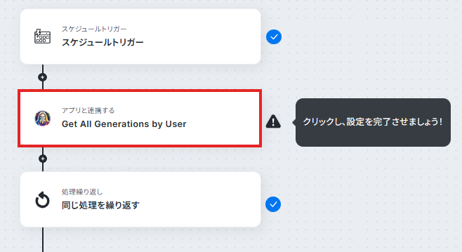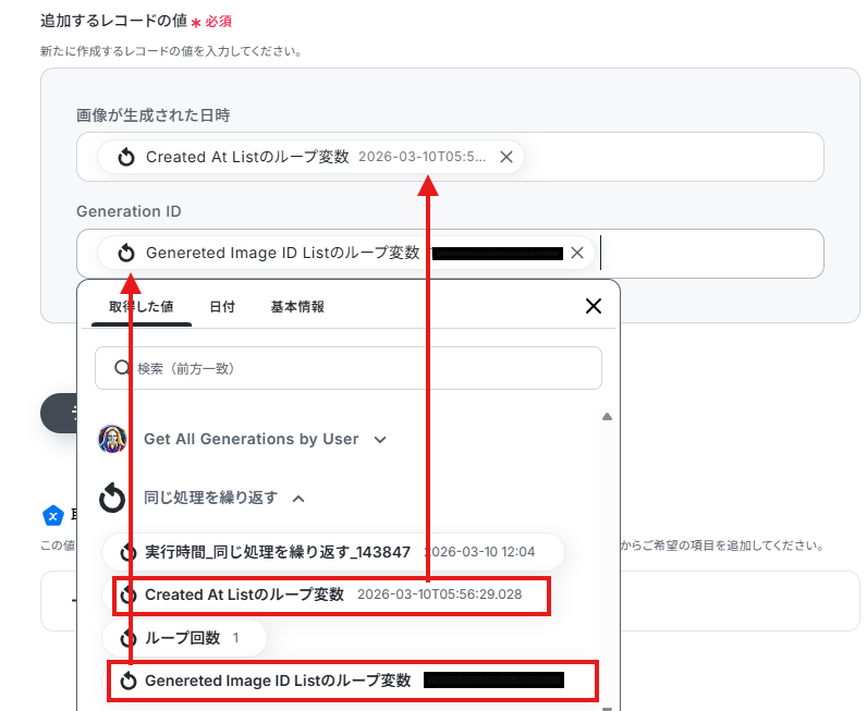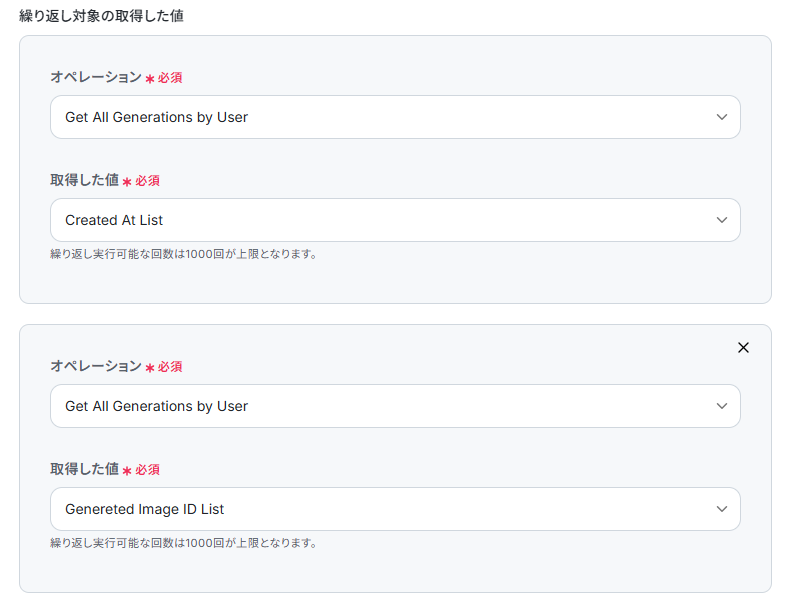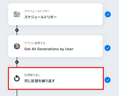 - 続いて、オペレーションの「同じ処理を繰り返す」を設定し、取得した複数の生成履歴を1件ずつ処理できるようにします。