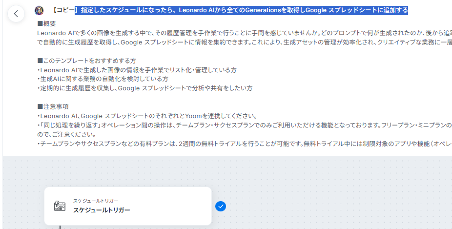 それではここから代表的な例として、指定したスケジュールになったら、Leonardo AIから全ての生成履歴を取得しGoogle スプレッドシートに追加するフローを解説していきます!