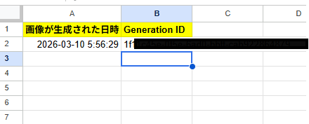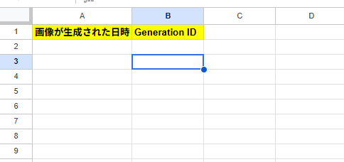 今回はLeonardo AIの情報をGoogleスプレッドシートに追加するため、事前に以下のようなGoogle スプレッドシートを準備してました。