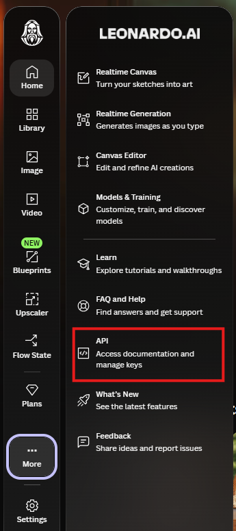 Leonardo AI にログインし、画面左下の [API Access] をクリックしてください。