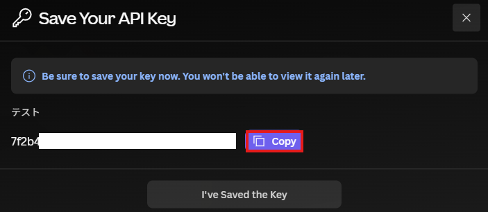 表示された API Key をコピーします。※一度しか表示されないため、安全な場所に保管してください。
