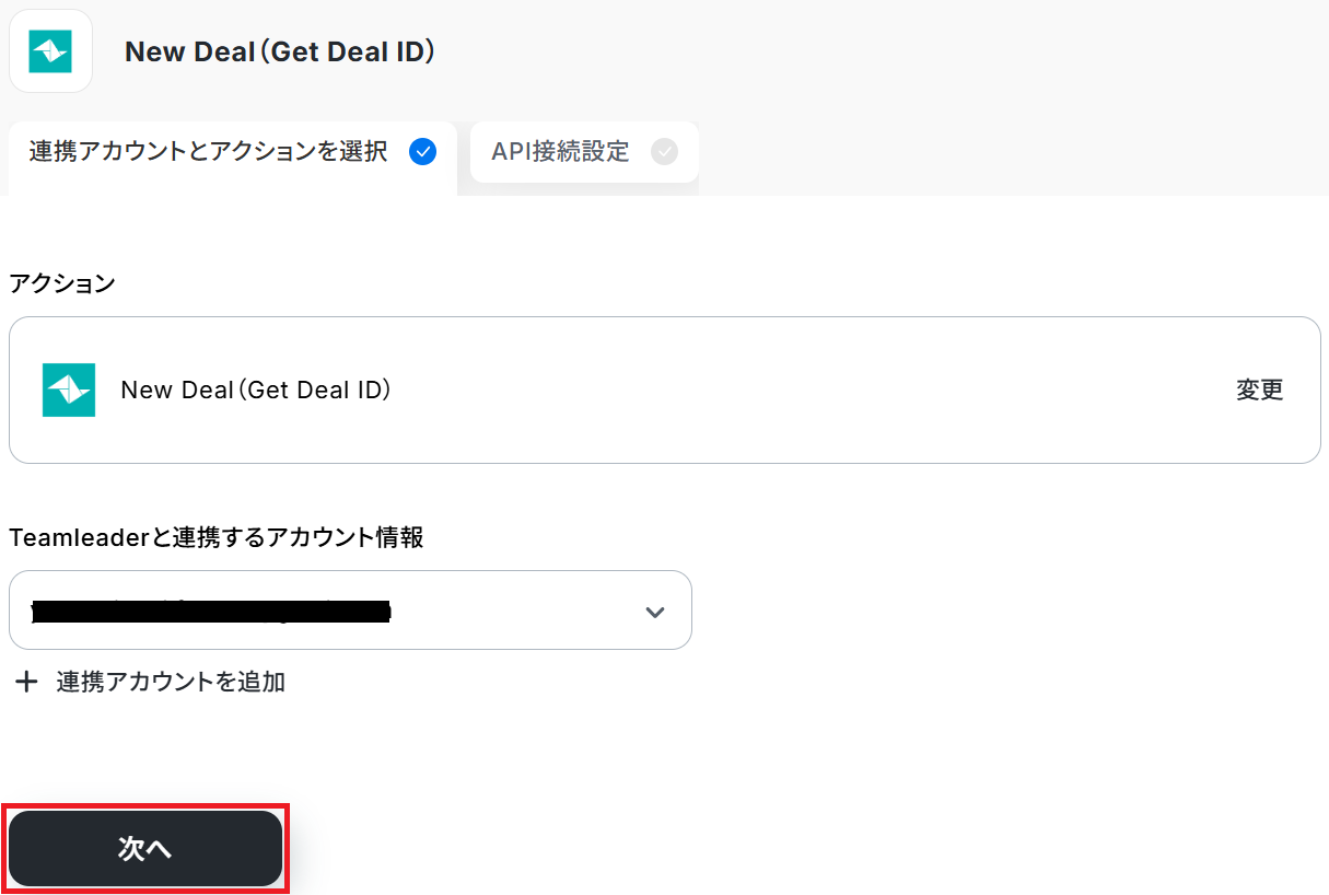 タイトルと連携するアカウント情報を任意で設定し、アクションはテンプレート通りに「New Deal(Get Deal ID)」のまま「次へ」をクリックします。