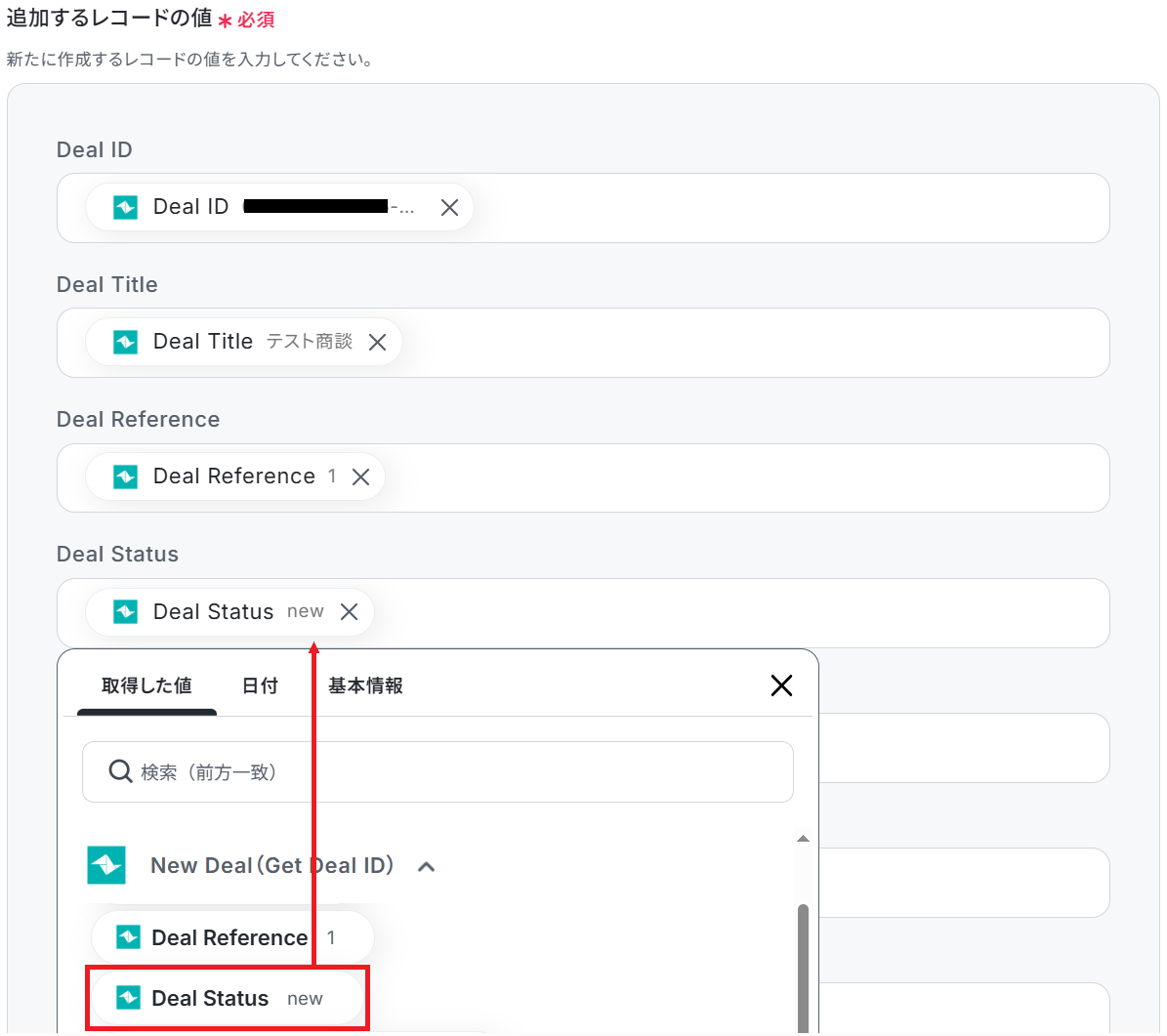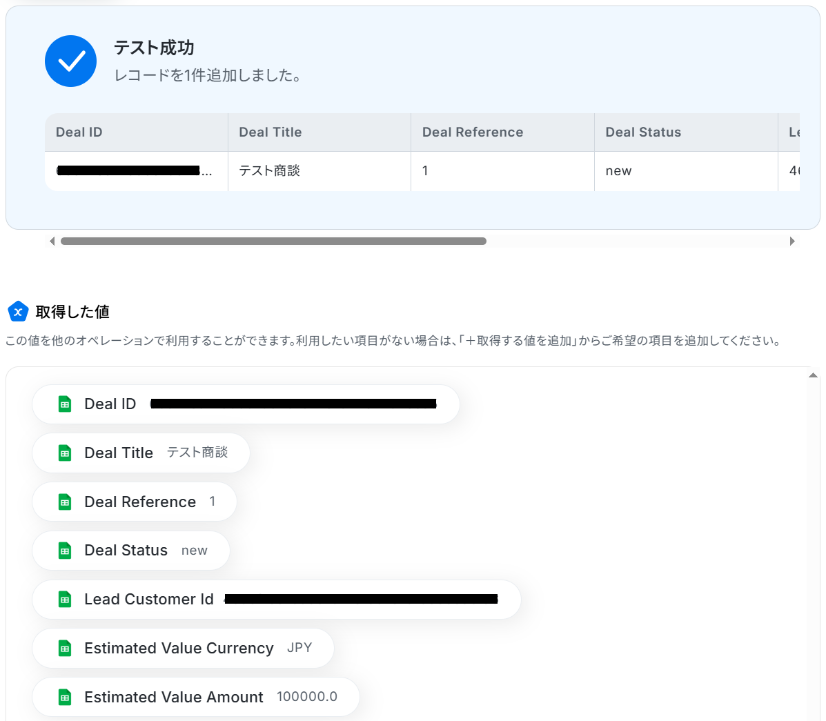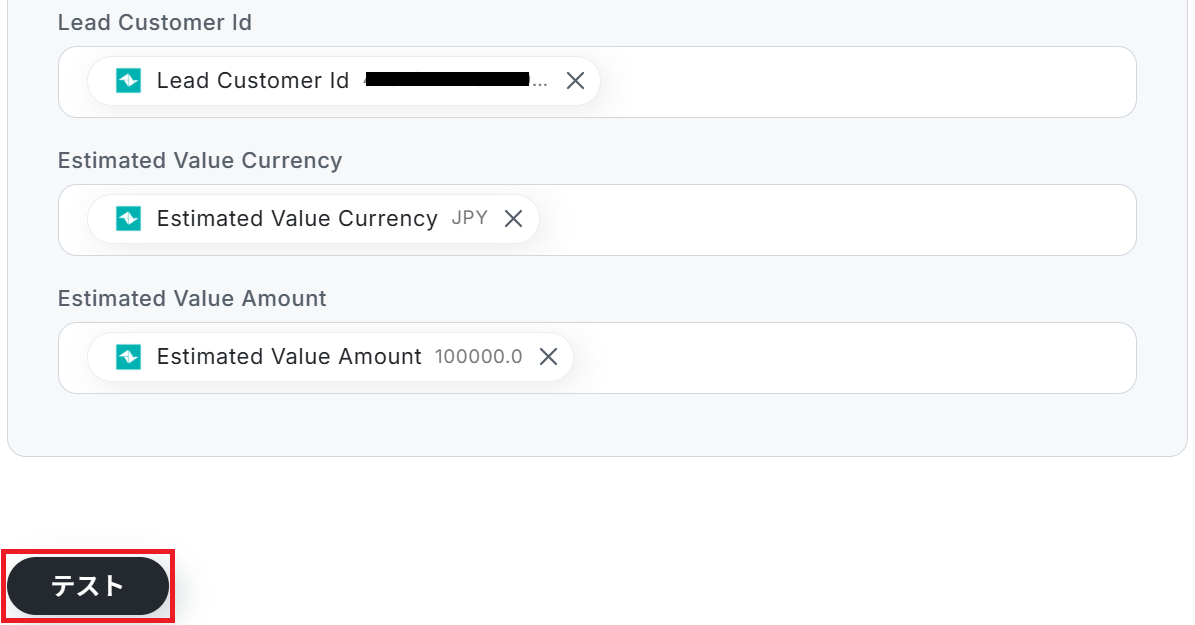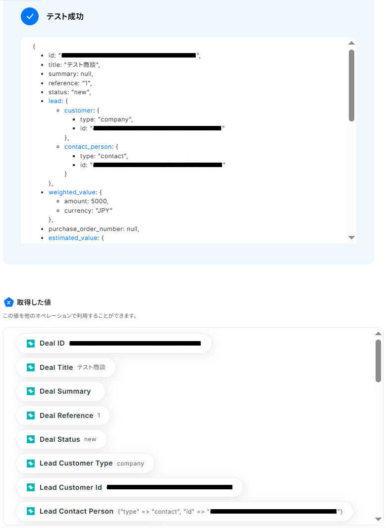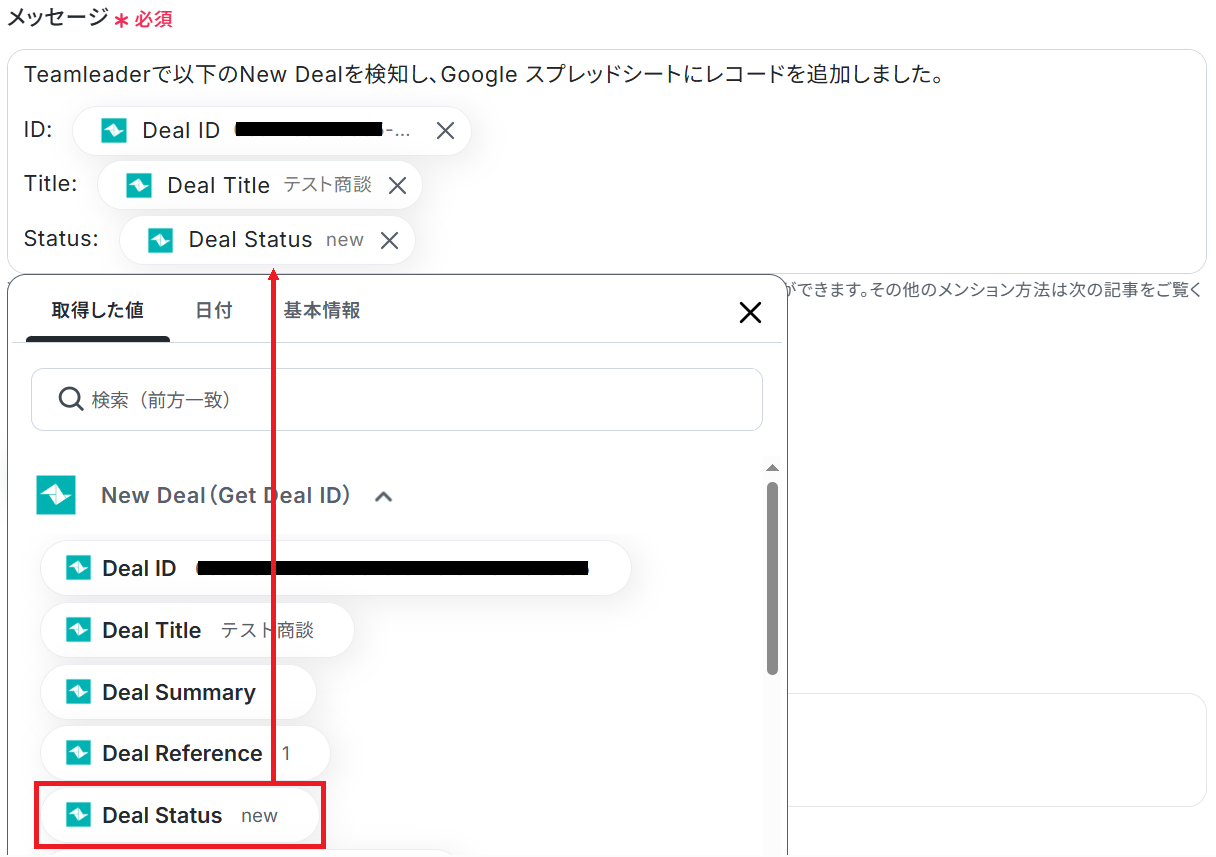 以下のようにTeamleaderから取得した値を設定することで、トリガーが実行されるたびに最新の商談情報を反映できます。
