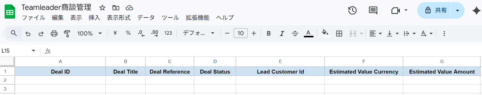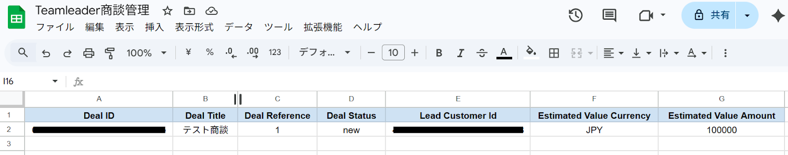 ※レコード更新の際は、シートの中に他の列とデータが重複しない一意の値が入った列を作成しておく必要があります。今回でいうとA列の「Deal ID」です。