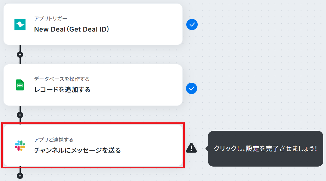 - 最後に、オペレーションでSlackの「チャンネルにメッセージを送る」アクションを設定し、指定のチャンネルへ商談発生を通知します