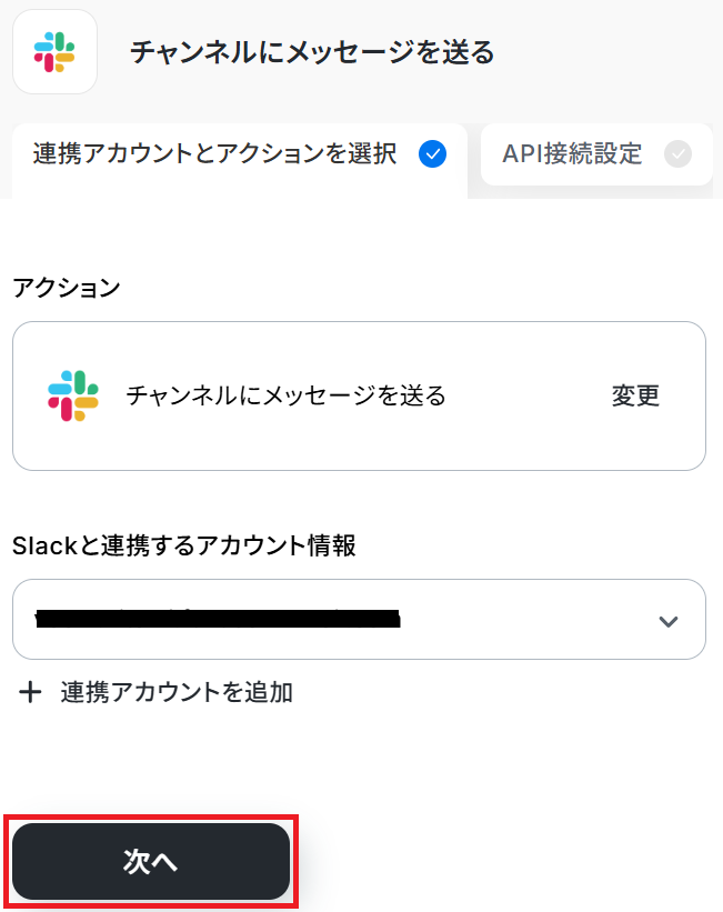 ステップ3と同様、アクションは「チャンネルにメッセージを送る」のまま「次へ」をクリックします。