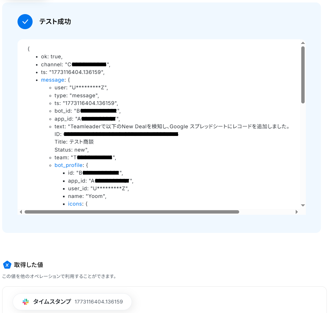 - Google スプレッドシートへの登録やSlackへの通知は、Teamleaderから取得した情報や固定のテキストを使用して自由にカスタマイズできます