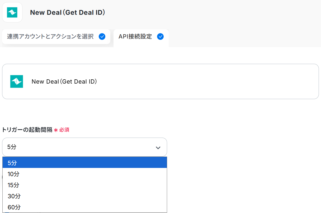 - トリガーは5分、10分、15分、30分、60分の間隔で起動間隔を選択できます。