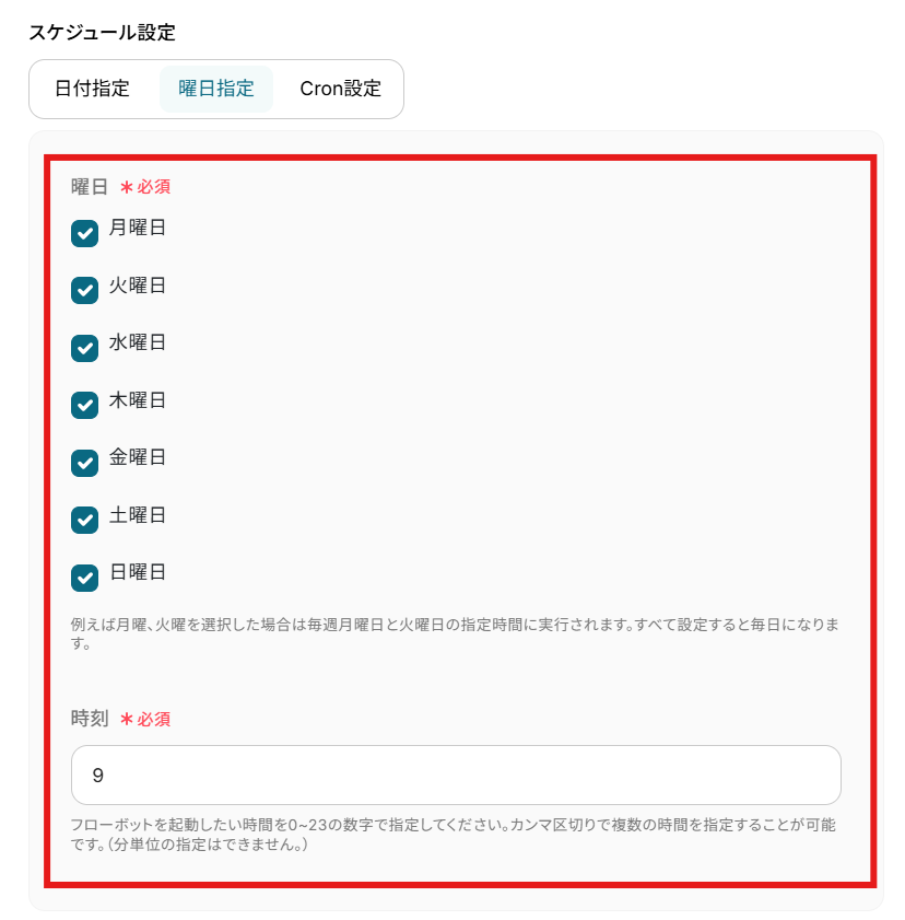 「日付指定」「曜日指定」「Cron設定」が可能です。