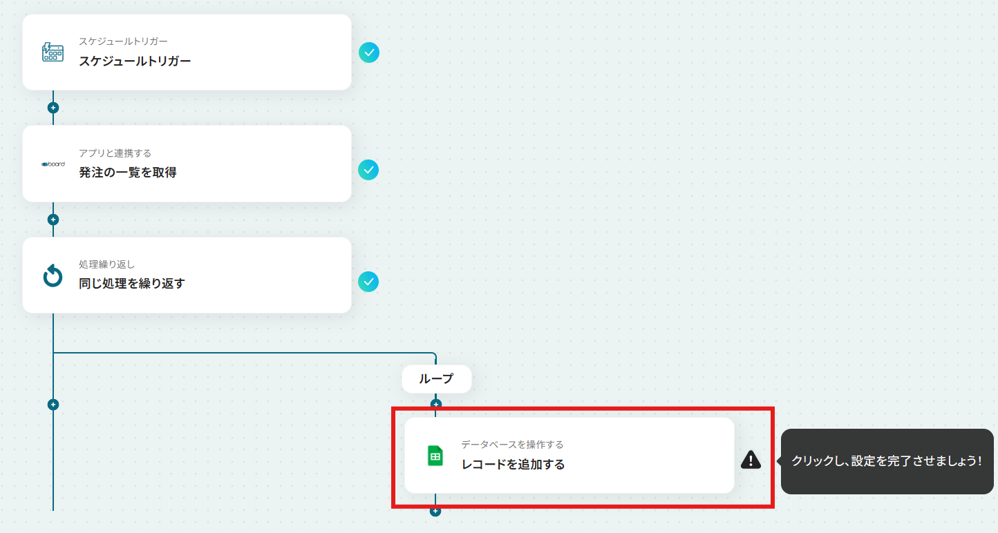 - 最後に、繰り返し処理の中でGoogle スプレッドシートの「レコードを追加する」アクションを設定し、発注情報を1行ずつ指定のシートに追記します