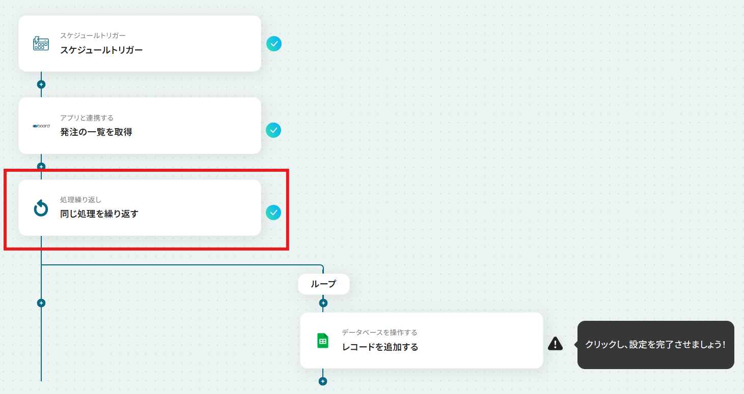 - 取得した複数の発注データを1件ずつ処理するため、オペレーションで「繰り返し処理」を設定します