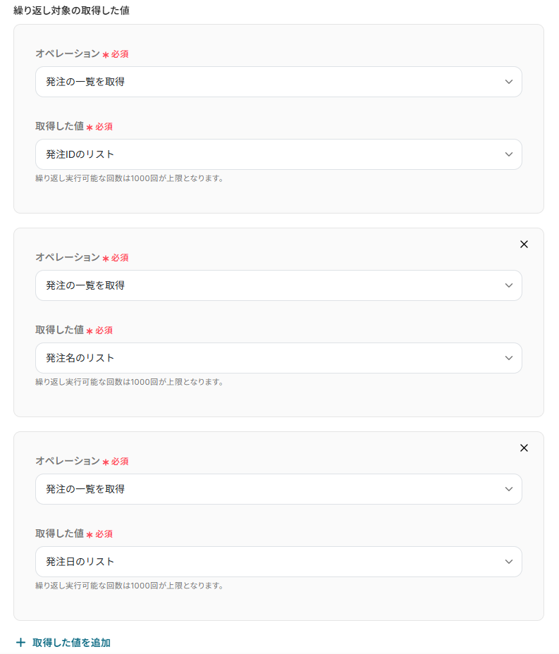 また、「+取得した値を追加」から「繰り返し対象の取得した値」を増やすことが可能です!