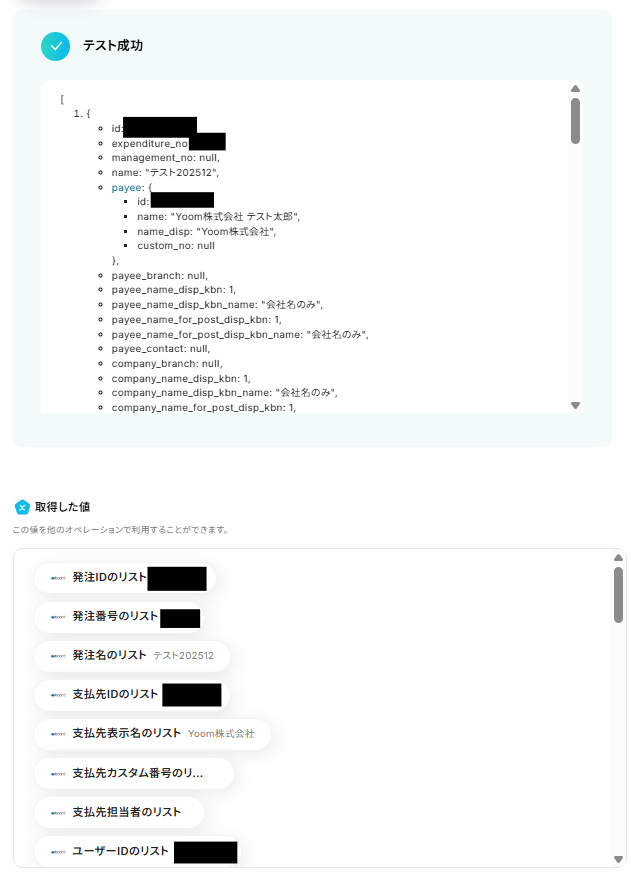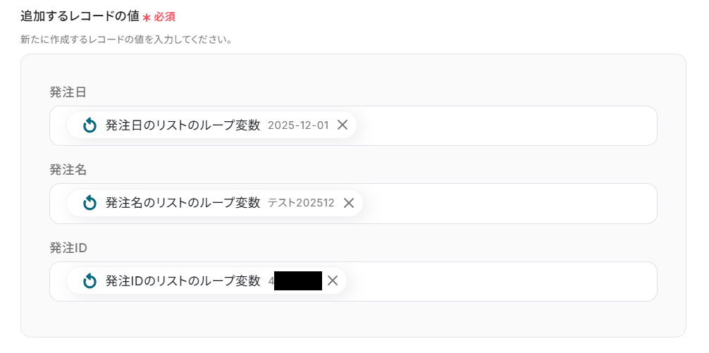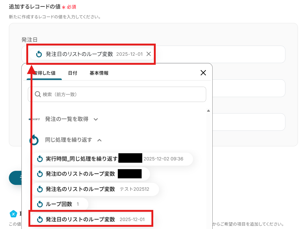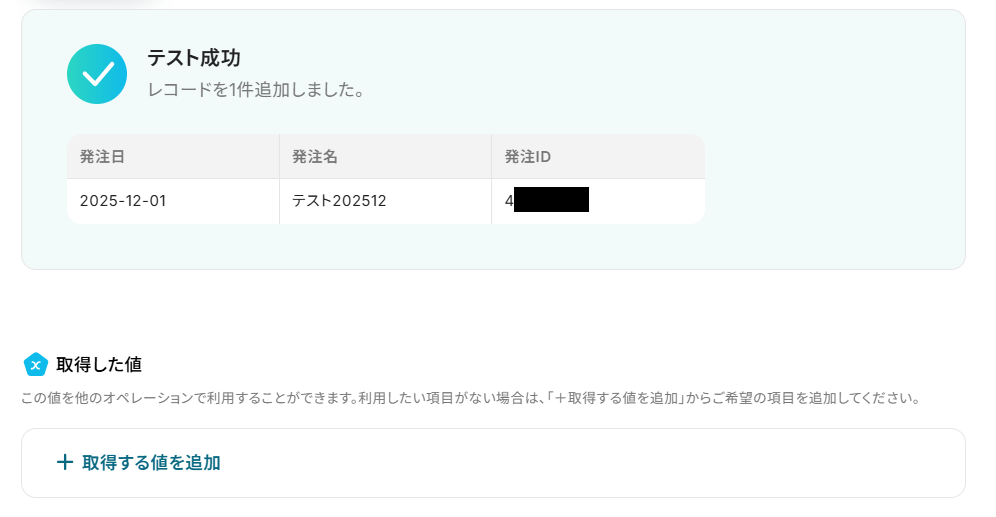 今回は例として、「取得した値」に「発注IDのリスト」・「発注名のリスト」・「発注日のリスト」を設定しました!