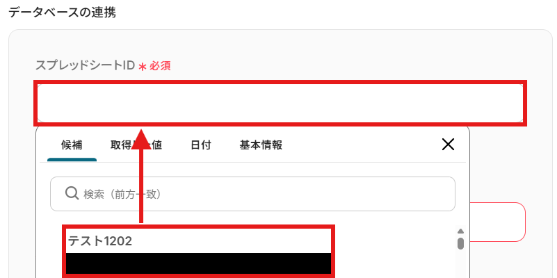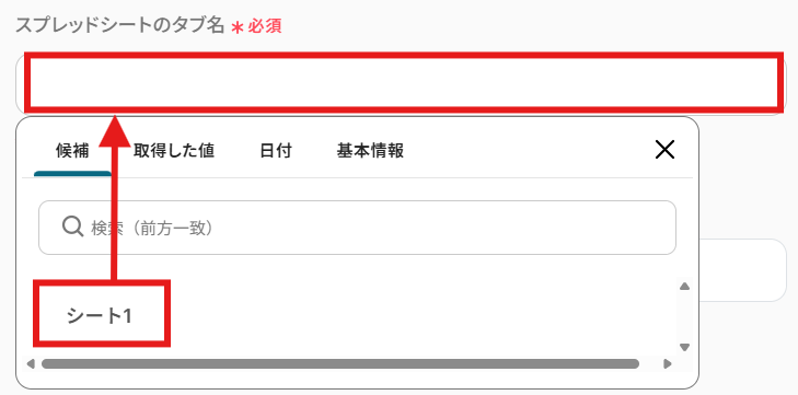 今回のフローで使用したいGoogle スプレッドシートの「スプレッドシートID」と「スプレッドシートのタブ名」を候補から選択しましょう。