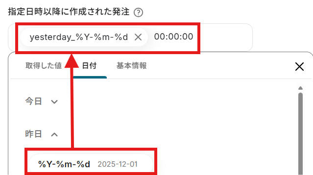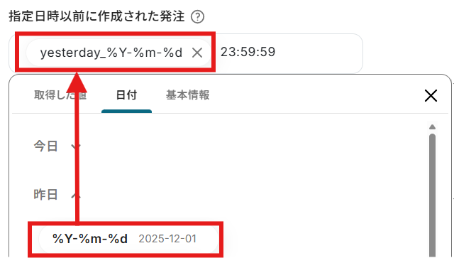 今回は前日分の発注一覧を取得したいので、以下のように設定しました!