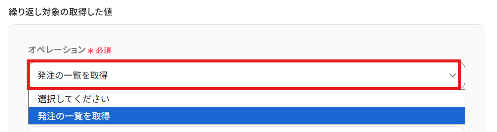 「オペレーション」を「発注の一覧を取得」に設定します。