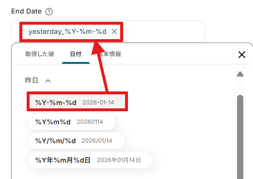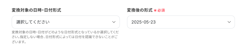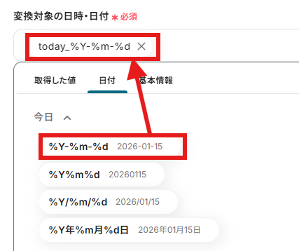 「変換対象の日時・日付」は、フロー起動日としたいため「日付」の項目から、「今日」のハイフン区切りのものを入力します。
