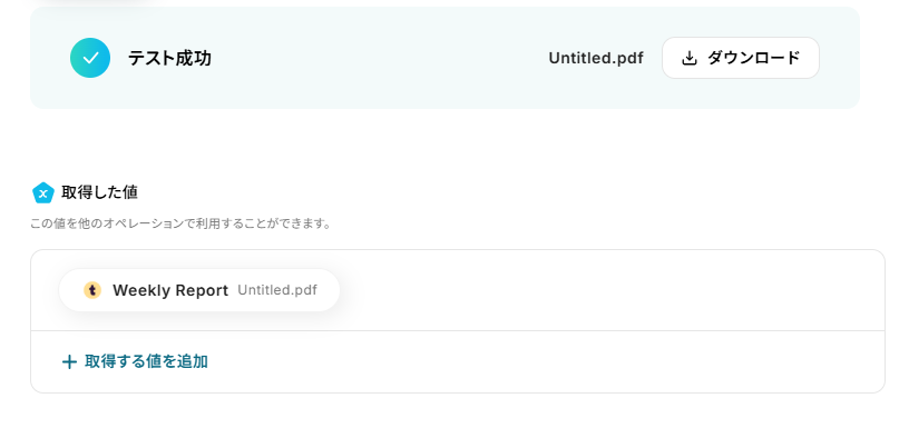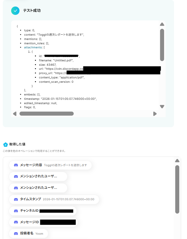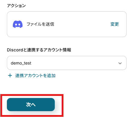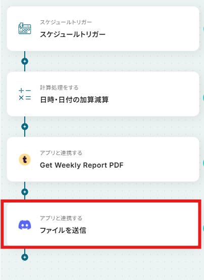 - 最後に、Discordの「ファイルを送信」アクションを設定し、取得したPDFファイルを指定のチャンネルに送信します