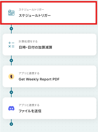 このワークフローは、スケジュールに合わせてTogglから週報のPDFを自動で取得し、Discordの指定チャンネルへ定期的に送信します。