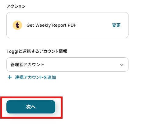 - 次に、Togglの「Get Weekly Report PDF」アクションを設定し、前のステップで算出した日付を元に週報を取得します