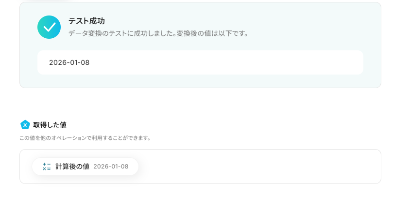 ここまで設定したらテストボタンをクリックします。テストが成功し、計算された日付が取得した値に入ればOKです。
