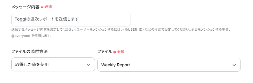 このページ内にはTogglの週報取得に関して、他にも設定できる項目があります。必要に応じて設定してください。