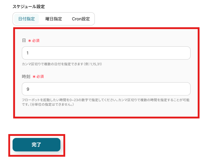 今回は毎月一日、時刻は9時にフローボットを起動する設定にしました。