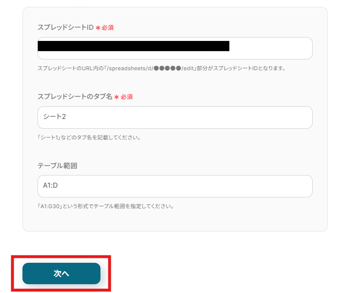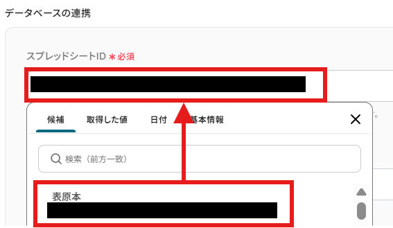 スプレッドシートのタブ名も候補より選択できますので、同じように入力してください。