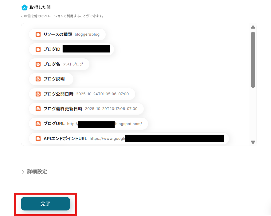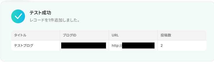 上記が終わったらテストボタンを押します。テストが成功し、取得した値が入ればOKです。