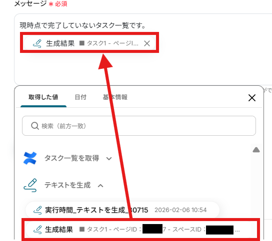 - Slackで送信するメッセージの本文は、固定のテキストを入力するだけでなく、前段のオペレーションでConfluenceから取得したタスク名などの情報を変数として埋め込むといった柔軟なカスタマイズができます