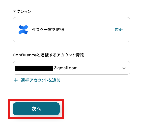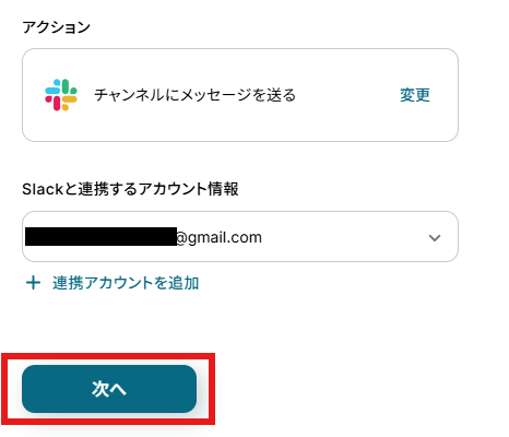 アクションはデフォルト設定のまま、アカウント情報は、連携したいアカウントが選択されているか確認してください。確認が終わったら「次へ」で進みましょう。