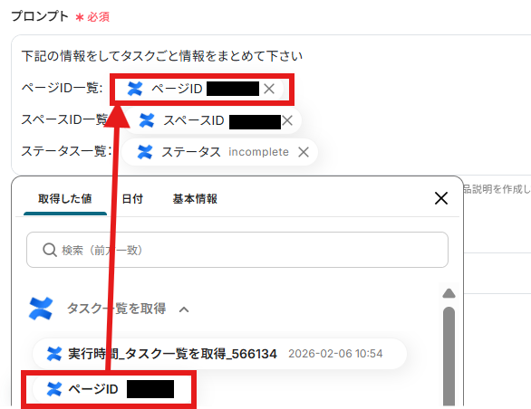 - 次に、オペレーションでConfluenceの「タスク一覧を取得」アクションを設定し、未完了のタスク情報を取得します