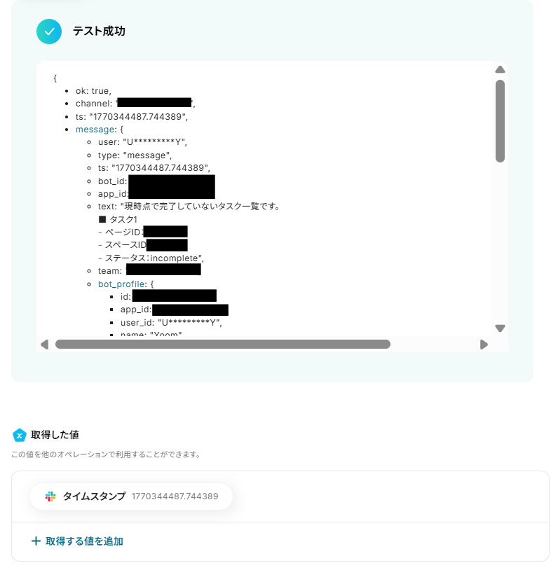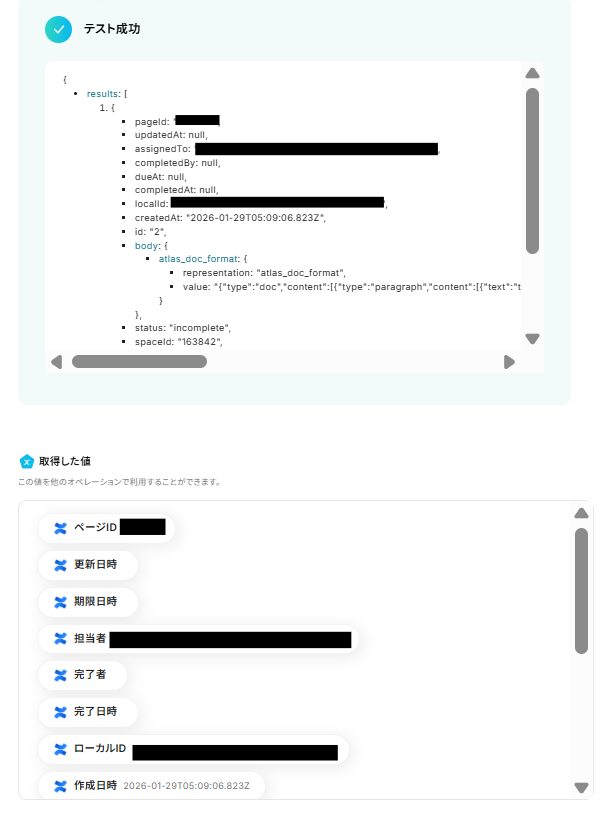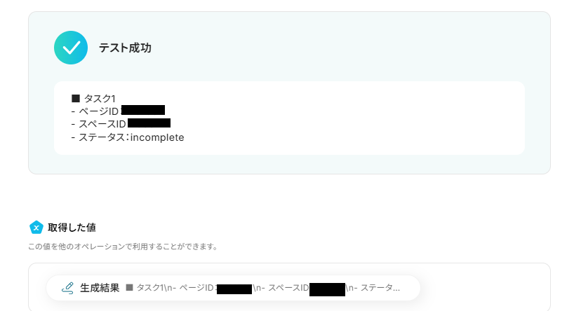 ここまで設定したらテストボタンをクリックしてください。テストが成功し、整理された内容が取得した値に入ります。