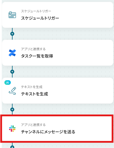 - 最後に、オペレーションでSlackの「チャンネルにメッセージを送る」アクションを設定し、整形したタスク一覧を指定のチャンネルに通知します