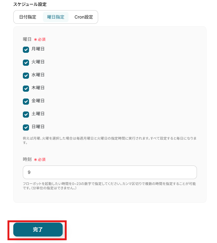 任意のスケジュールを設定したら、「完了」ボタンをクリックしてください。