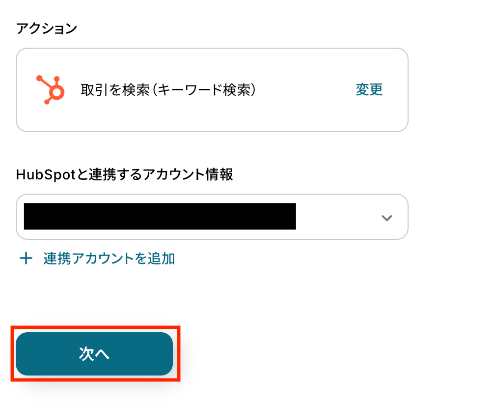 接続するHubSpotアカウントを選び「次へ」をクリックします。